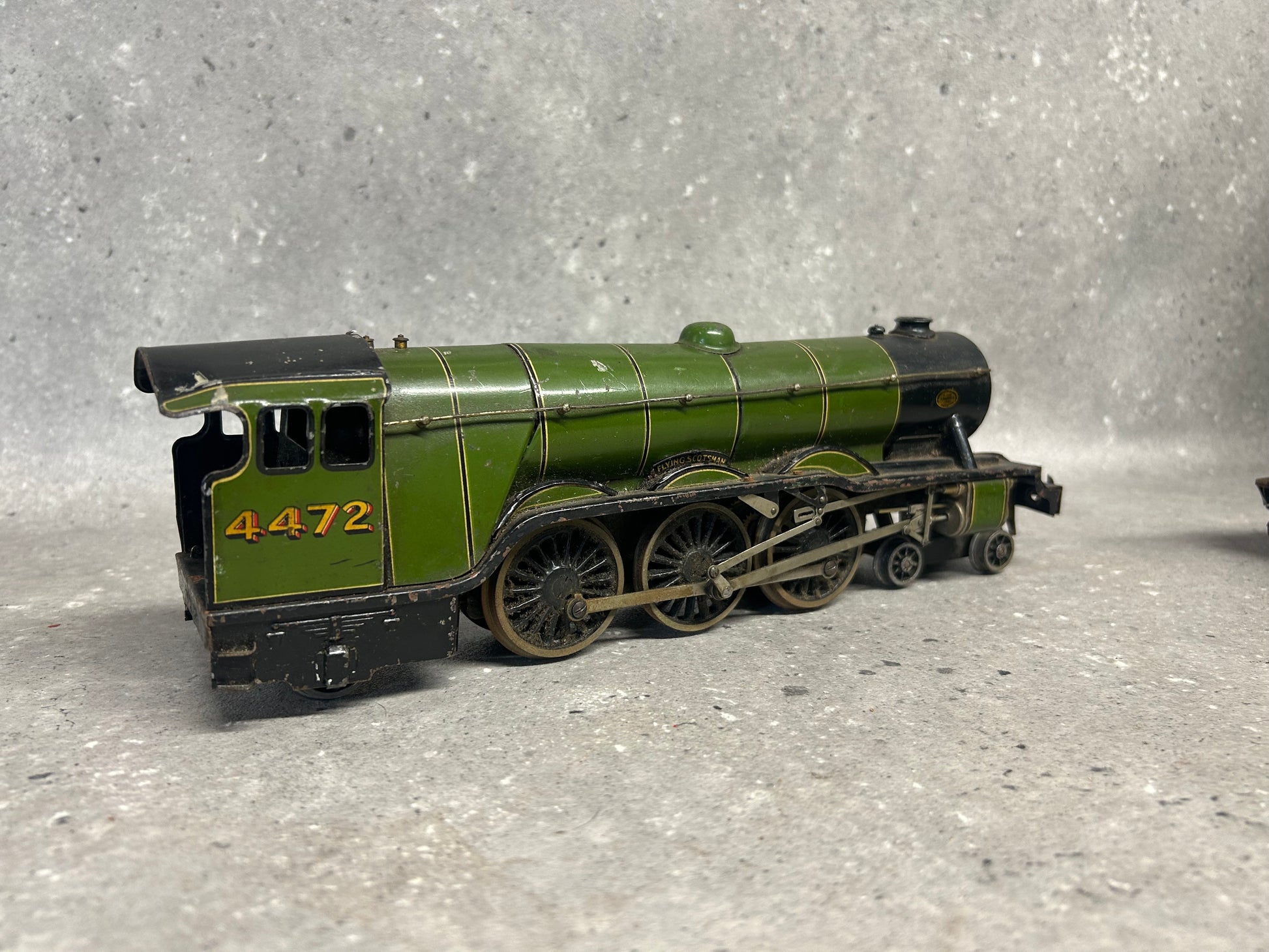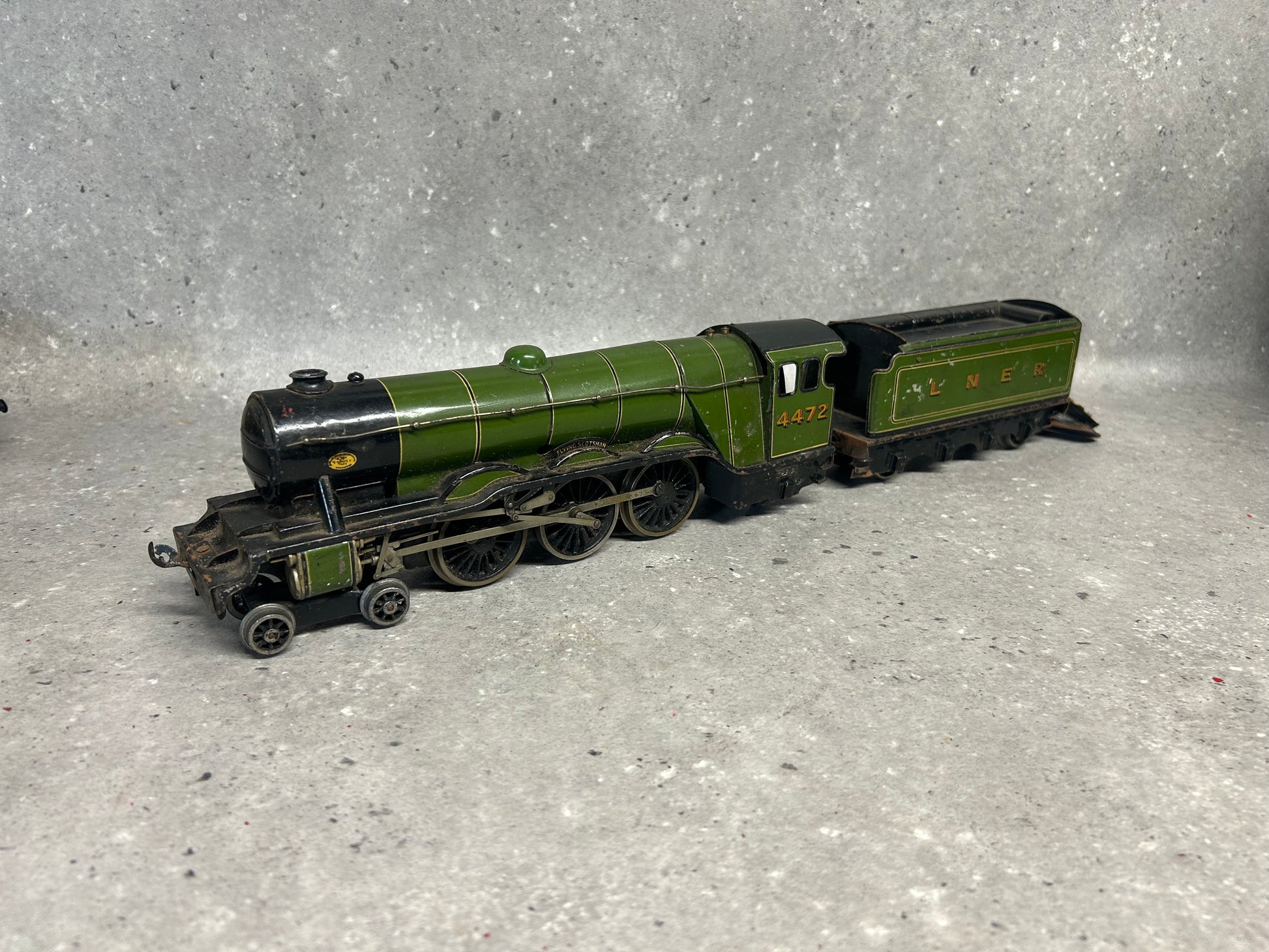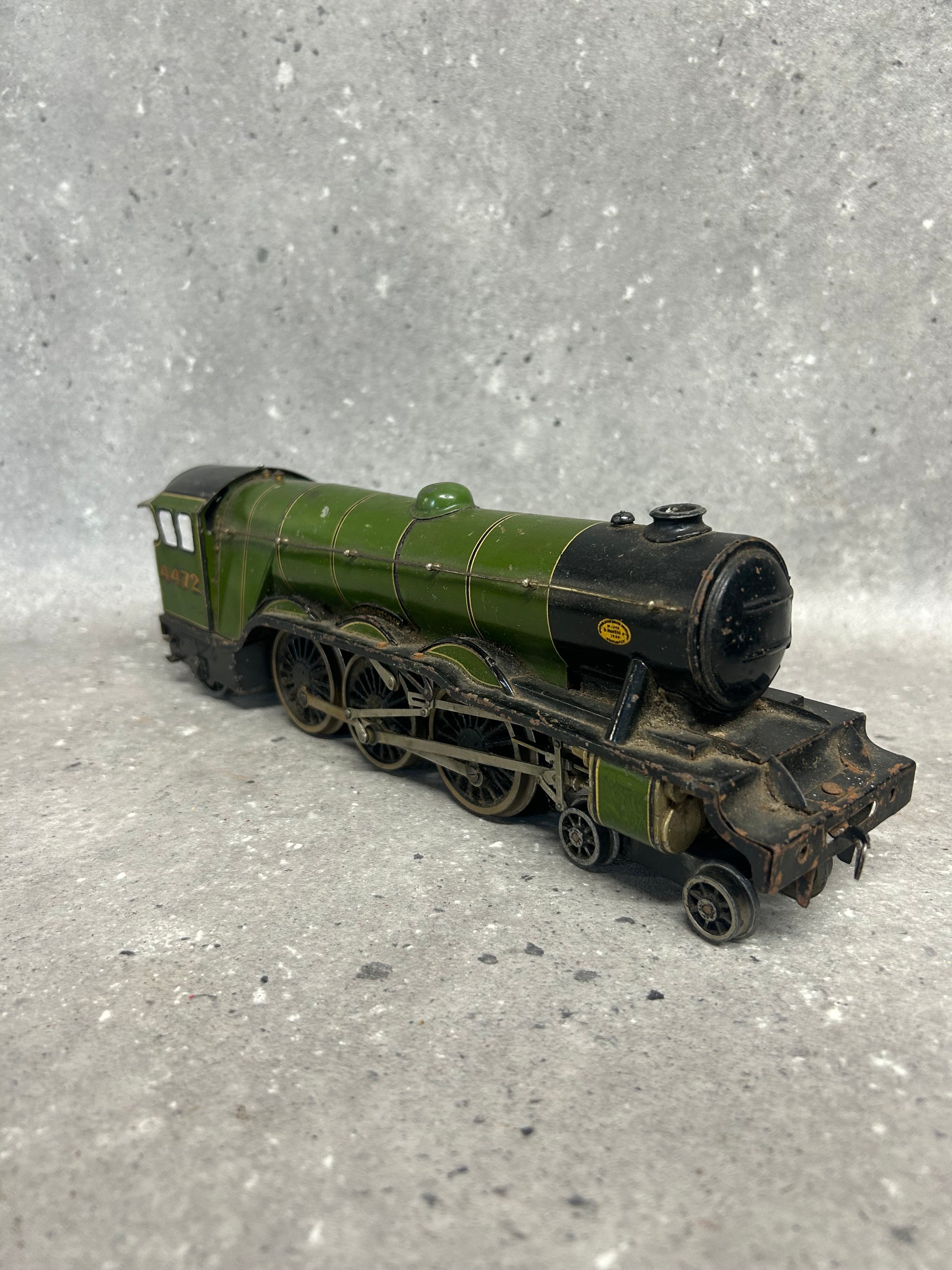 An original Bassett-Lowke Gauge "O" 4-6-2 "Flying Scotsman" Locomotive, No. 4472 in LNER colours. Complete with tender. This is an electric-powered locomotive which was produced by Bassett-Lowke during the mid-20th century. Fitted with detailed cab and robust construction, this particular model is showing clear signs of age-related wear including some paint loss and occasional surface rust. The model does require a service because although the motion-works do turn, they are a little stiff and when bench tested did not operate as intended. The coupling hook at the rear of the cab does appear to be missing too. The tender has similar wear and requires some correction work to the retracting door. Any questions feel free to ask.