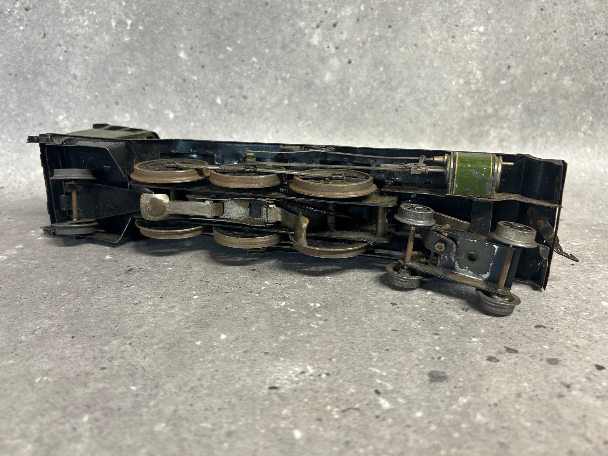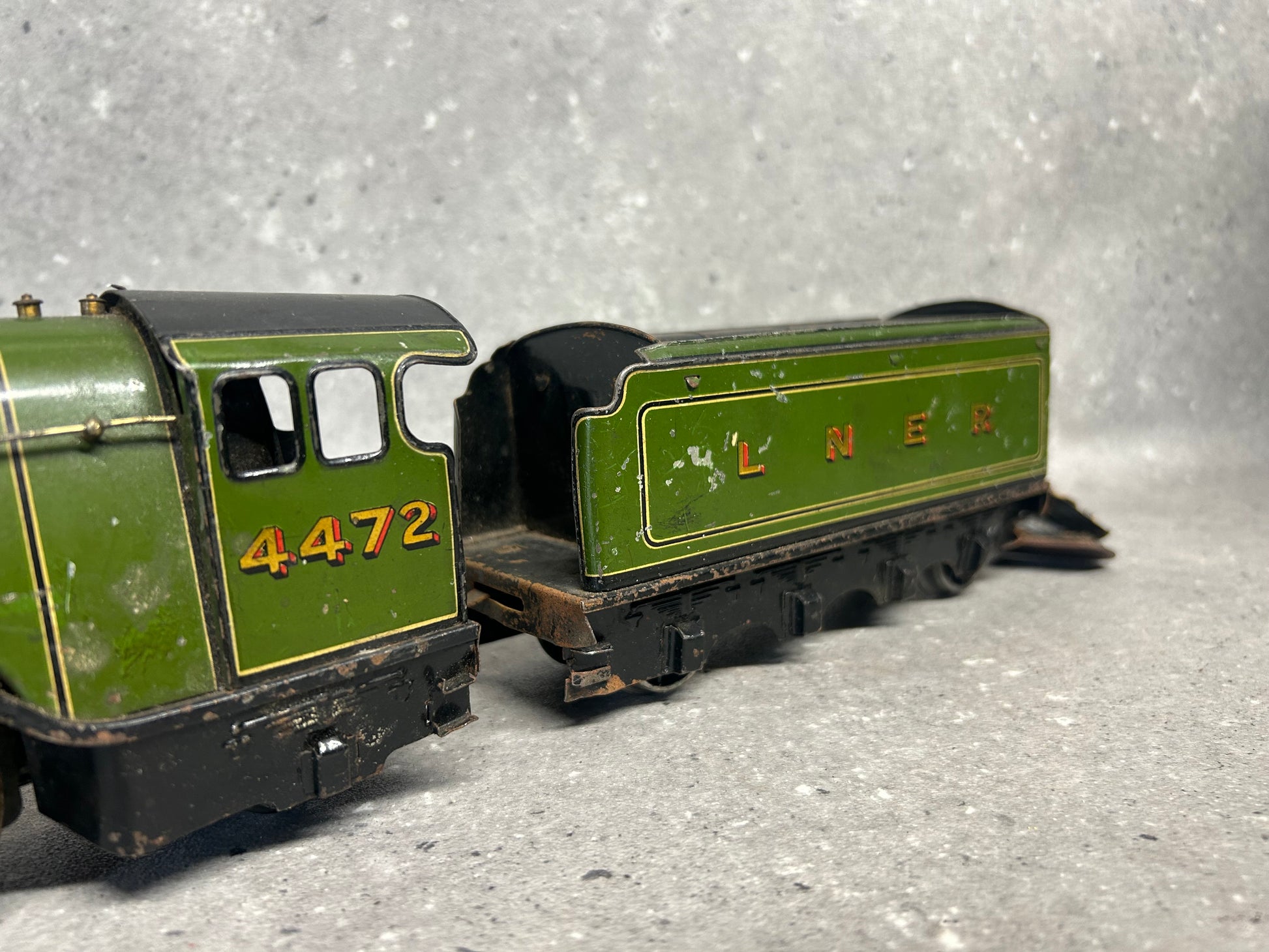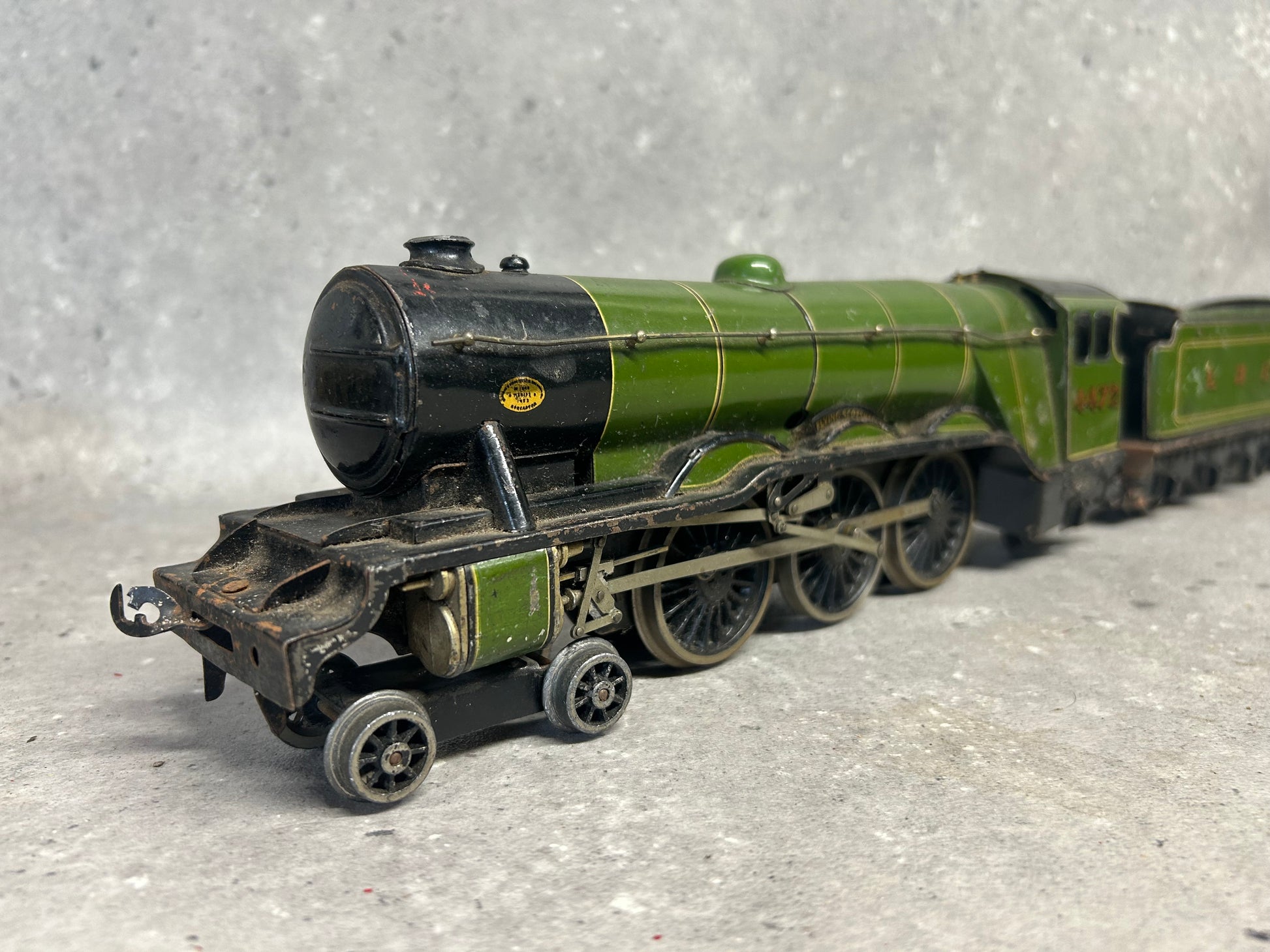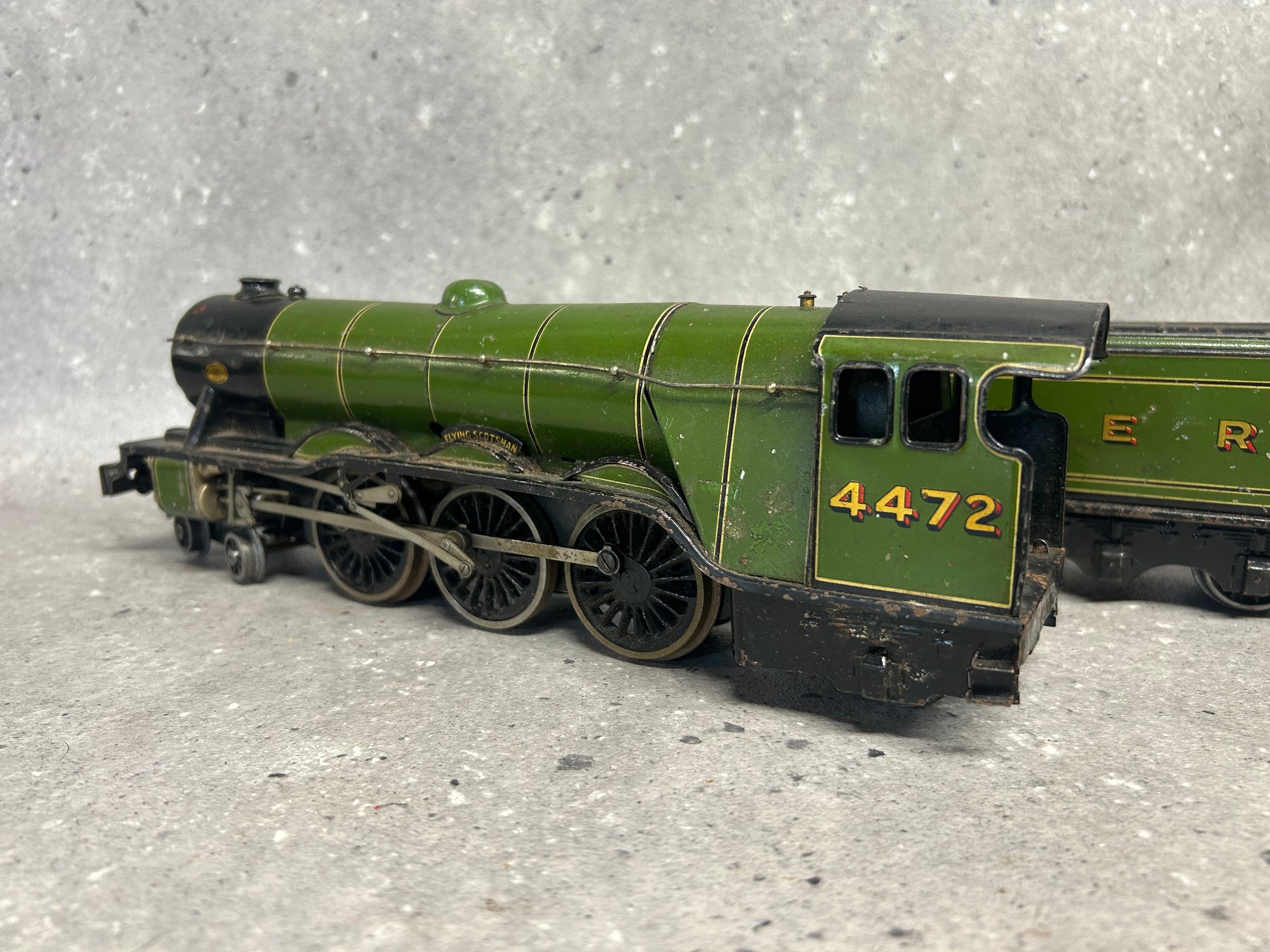 An original Bassett-Lowke Gauge "O" 4-6-2 "Flying Scotsman" Locomotive, No. 4472 in LNER colours. Complete with tender. This is an electric-powered locomotive which was produced by Bassett-Lowke during the mid-20th century. Fitted with detailed cab and robust construction, this particular model is showing clear signs of age-related wear including some paint loss and occasional surface rust. The model does require a service because although the motion-works do turn, they are a little stiff and when bench tested did not operate as intended. The coupling hook at the rear of the cab does appear to be missing too. The tender has similar wear and requires some correction work to the retracting door. Any questions feel free to ask.